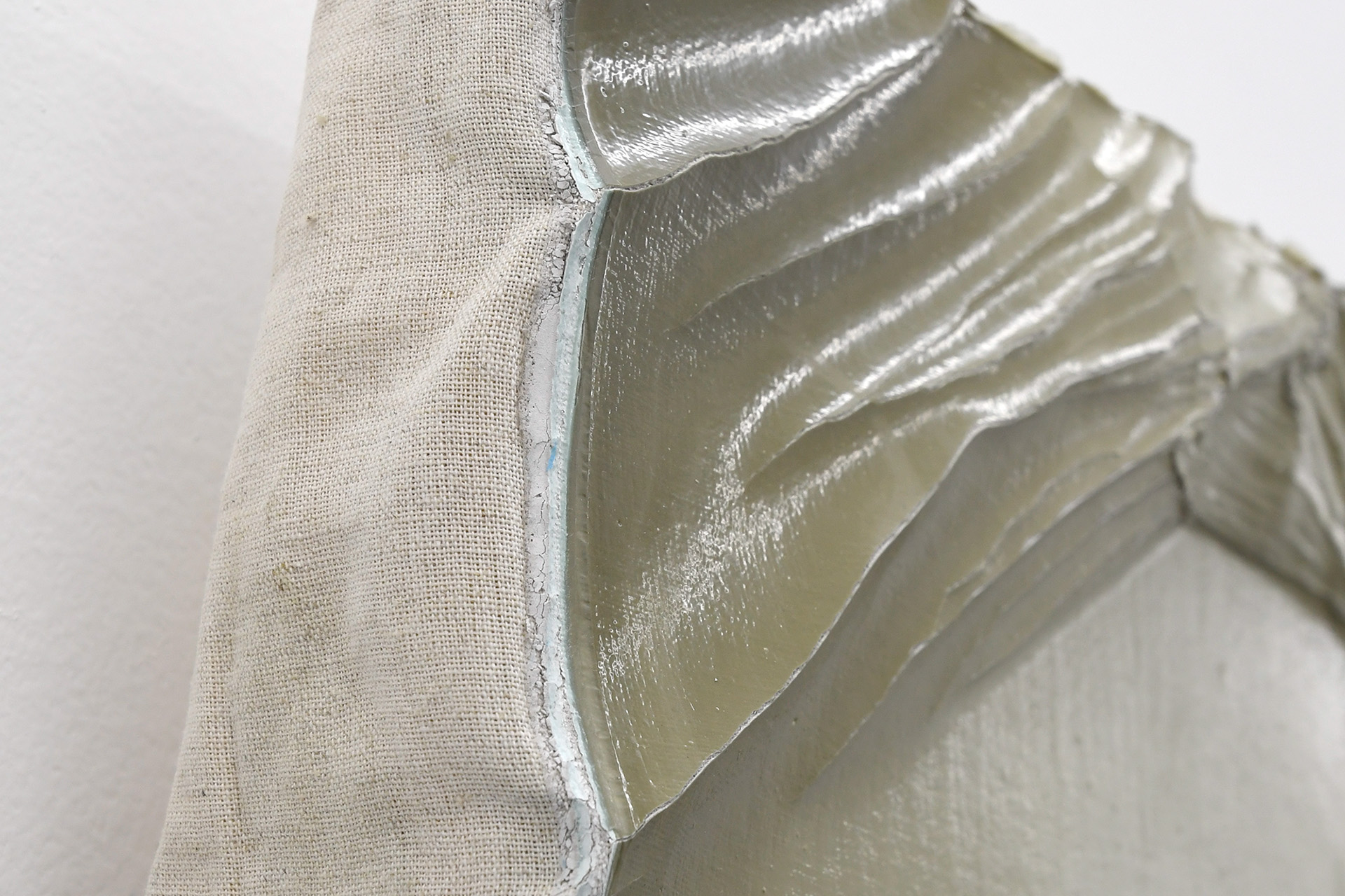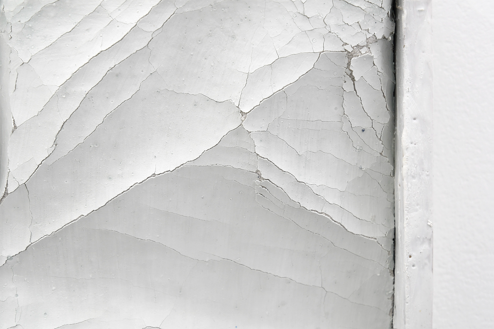 Looking at Marija’s works, the viewer often has to contemplate the subtle transparency of different materials, interactions between brittleness and matteness observing the cracks in the surfaces, which are the result of the artists (sometimes) brutal treatment of the canvas, as if breaking up the monochromatic background. » – Thibaud Leplat and Marija Rinkevičiūtė