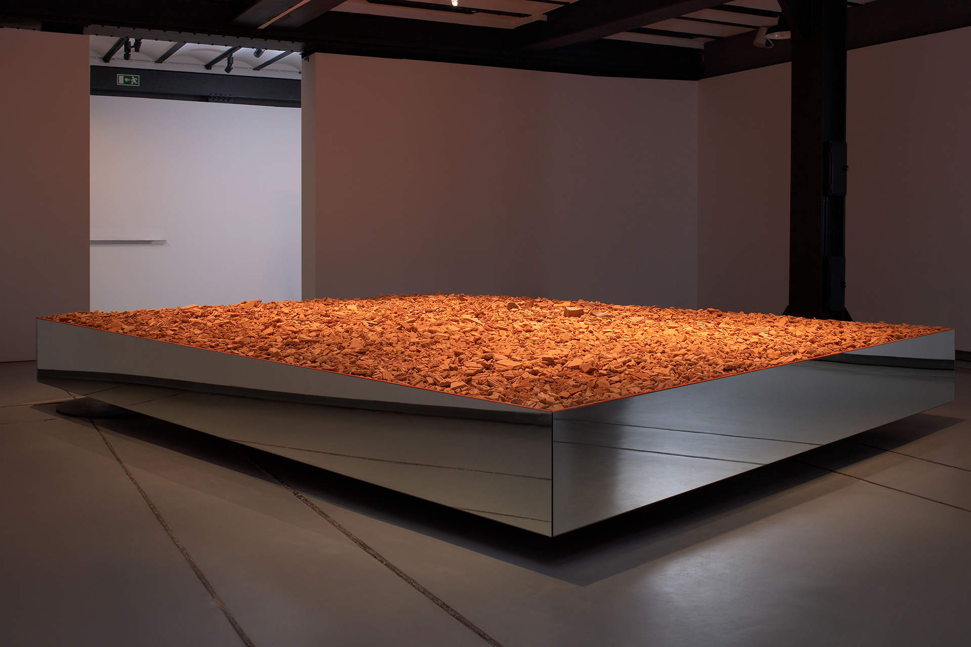At an exhibition held in 2009, the artist paraphrased Ralph Waldo Emerson, writing a politically engaged phrase on a wall where the MAAT Gallery now stands: “Landscape has no owner”. Inside, she compacted about 3,000 kilograms of brick waste into a low, delicate, suspended and mirrored volume (entitled Construir é destruir é construir [building is destroying is building], 2009). The contradiction is evident and deliberate: the brick, recovered from an abandoned factory, bears witness to the deindustrialisation and social changes that have taken place on the South Bank of the River Tagus; the mirrors dematerialise the piece, absorb the light and secure the surrounding space like a visual trap; suspended, the piece also suspends time, rising to a higher poetic platform that sublimates (and simultaneously underlines) the initial political message.”
