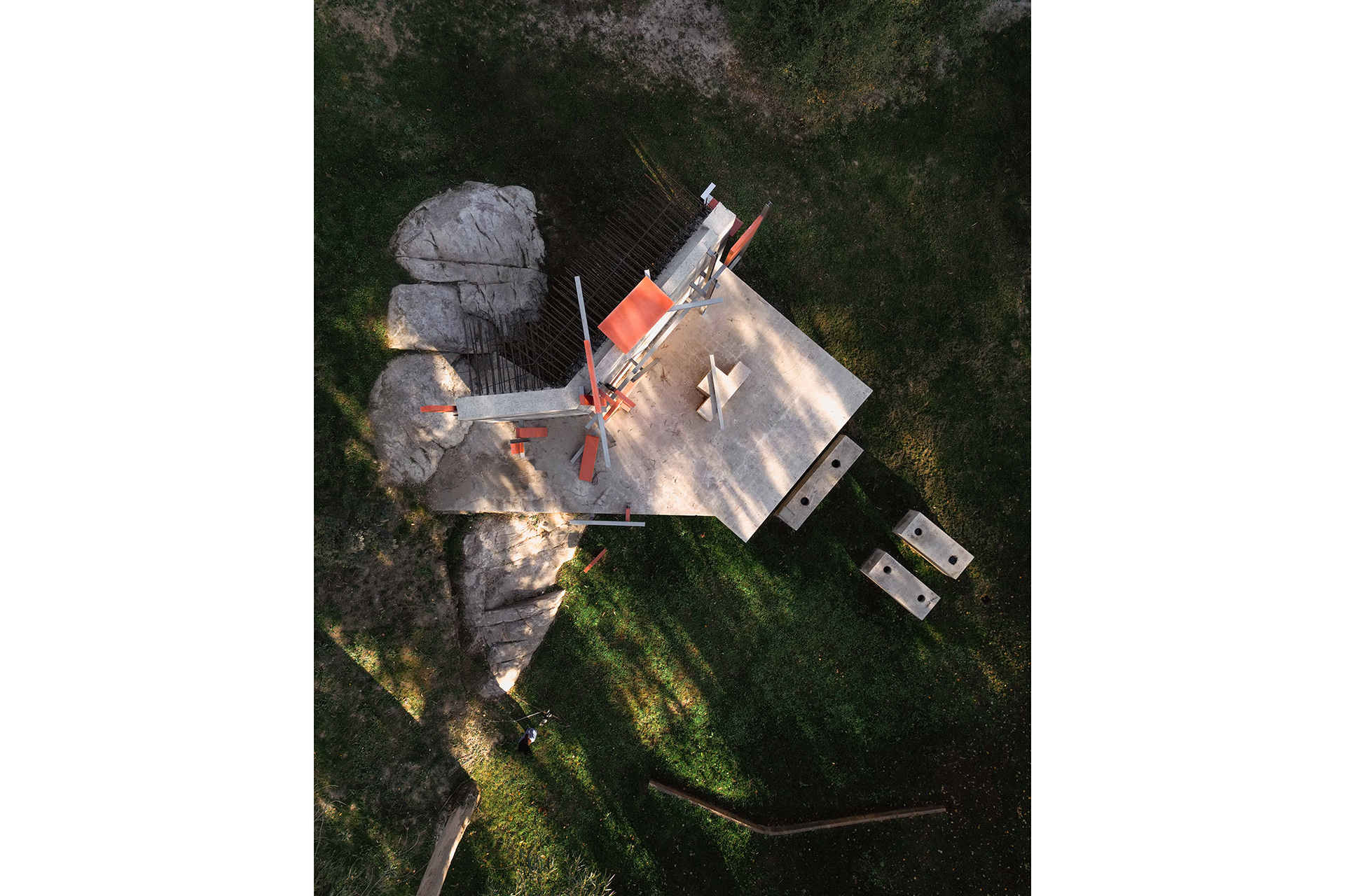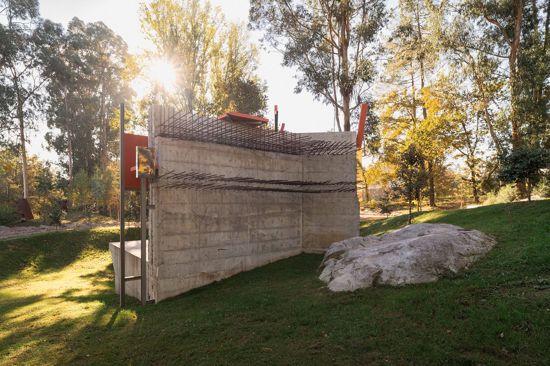 Emerging from this ruin, the sculpture enters into dialogue with the surrounding landscape, expanding with 31 metal beams, 15 red-pigmented concrete panels, and 3 polished stainless steel elements.