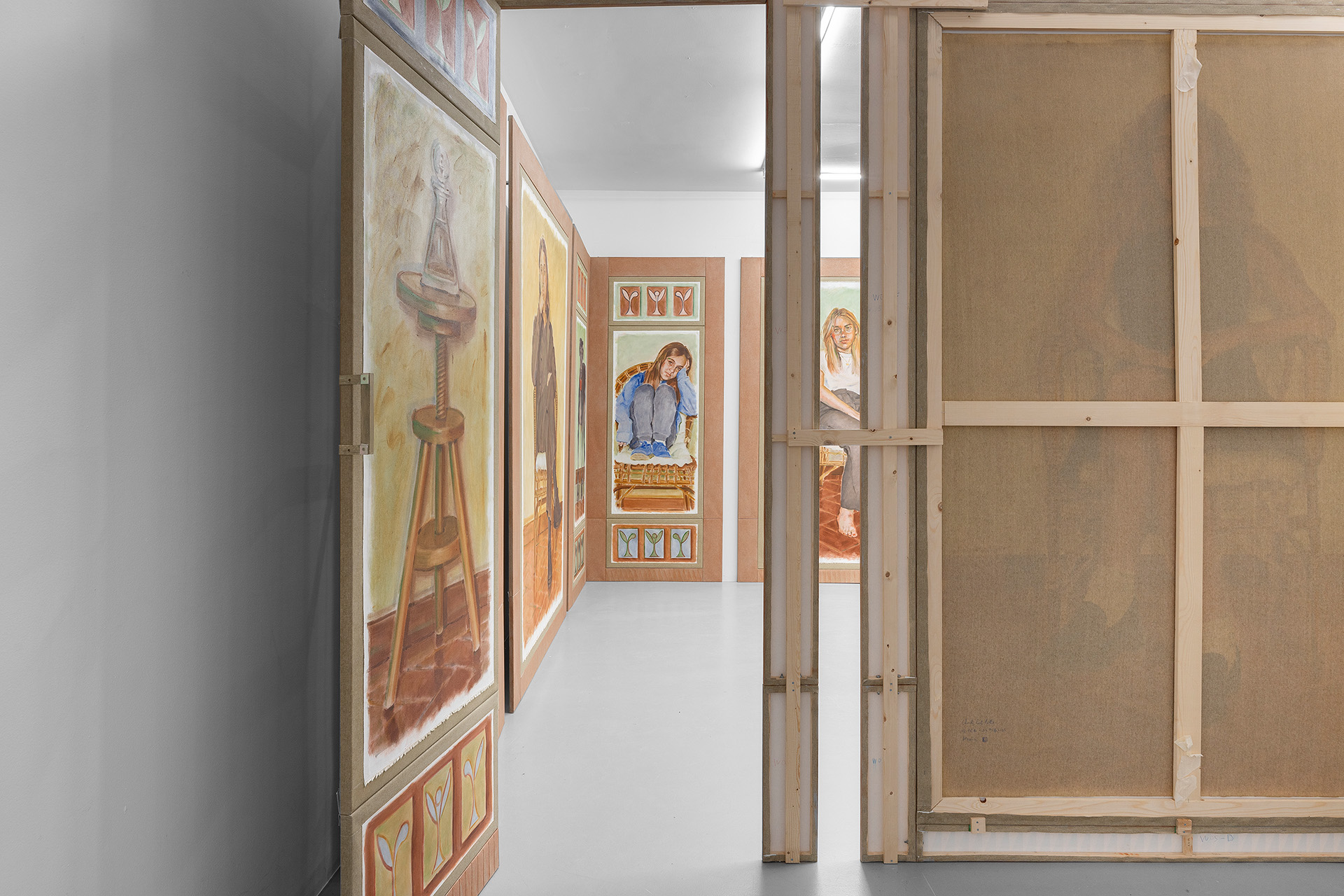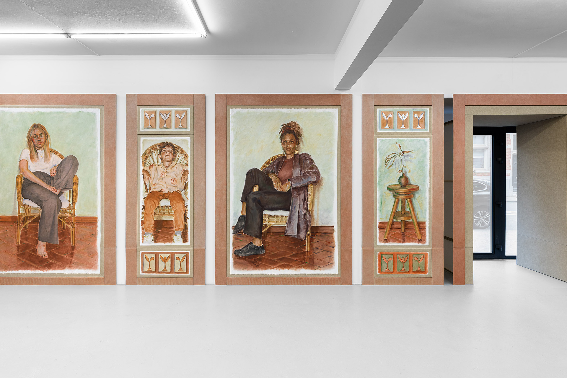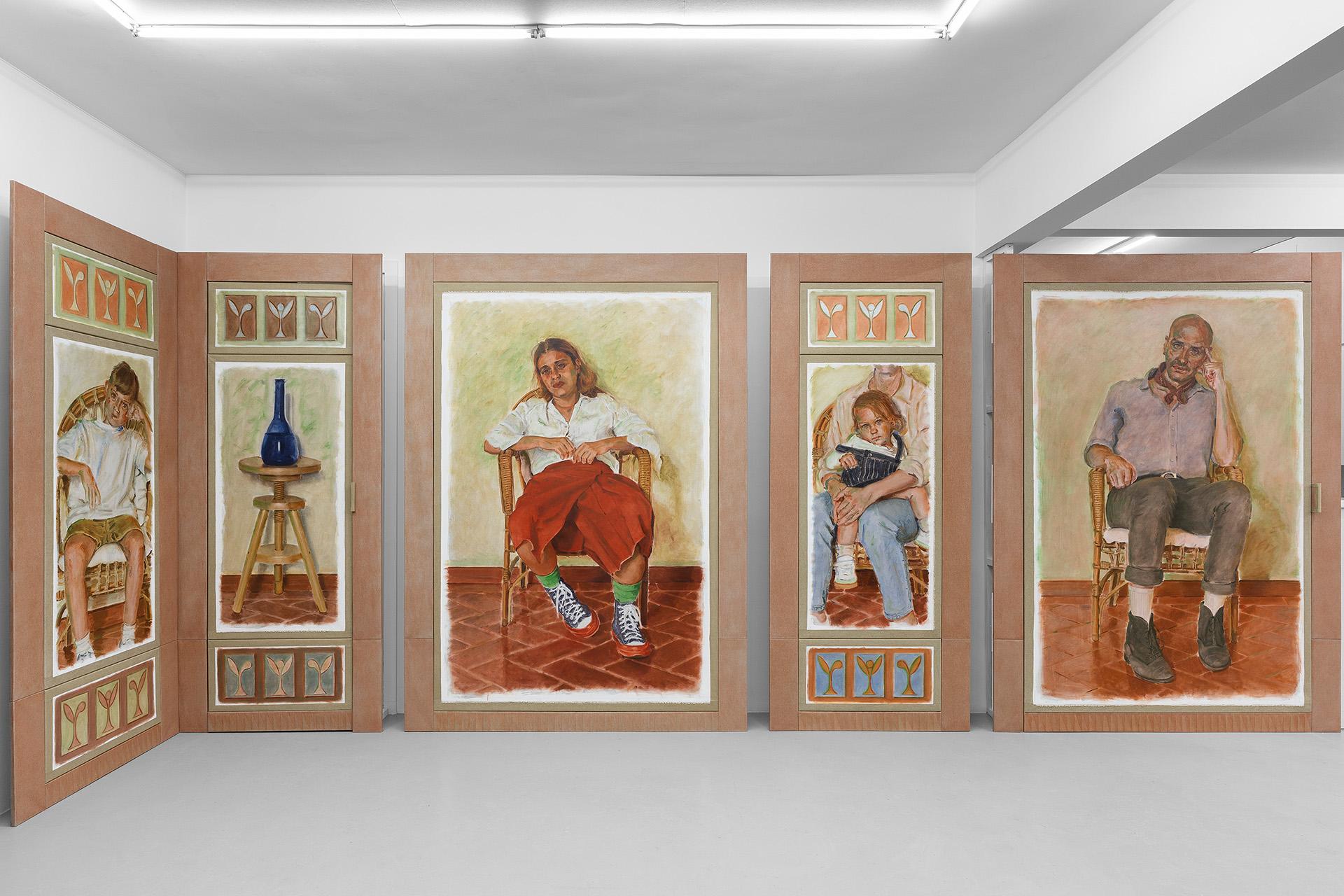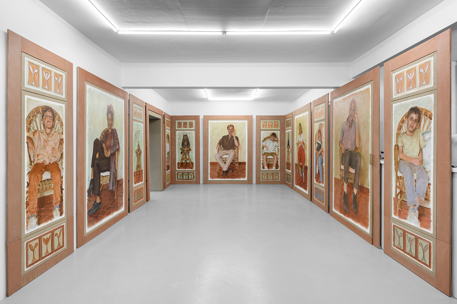 What are they thinking? What do they expect of us—these strange, silent witnesses frozen in time, emerging from the painted canvas, seated on the same chair, in the same spot, connected by the brick-red ceramic floor, unchanging and silent, and yet very much alive? They stare at us intently, with the force of their directness, in this very workspace, this studio, this place of memory, like a gallery of portraits and gigantic silhouettes, presiding over a patrician mansion from another era, elements of whose imaginary architectural decor can be found in the artist’s imagined scenography.