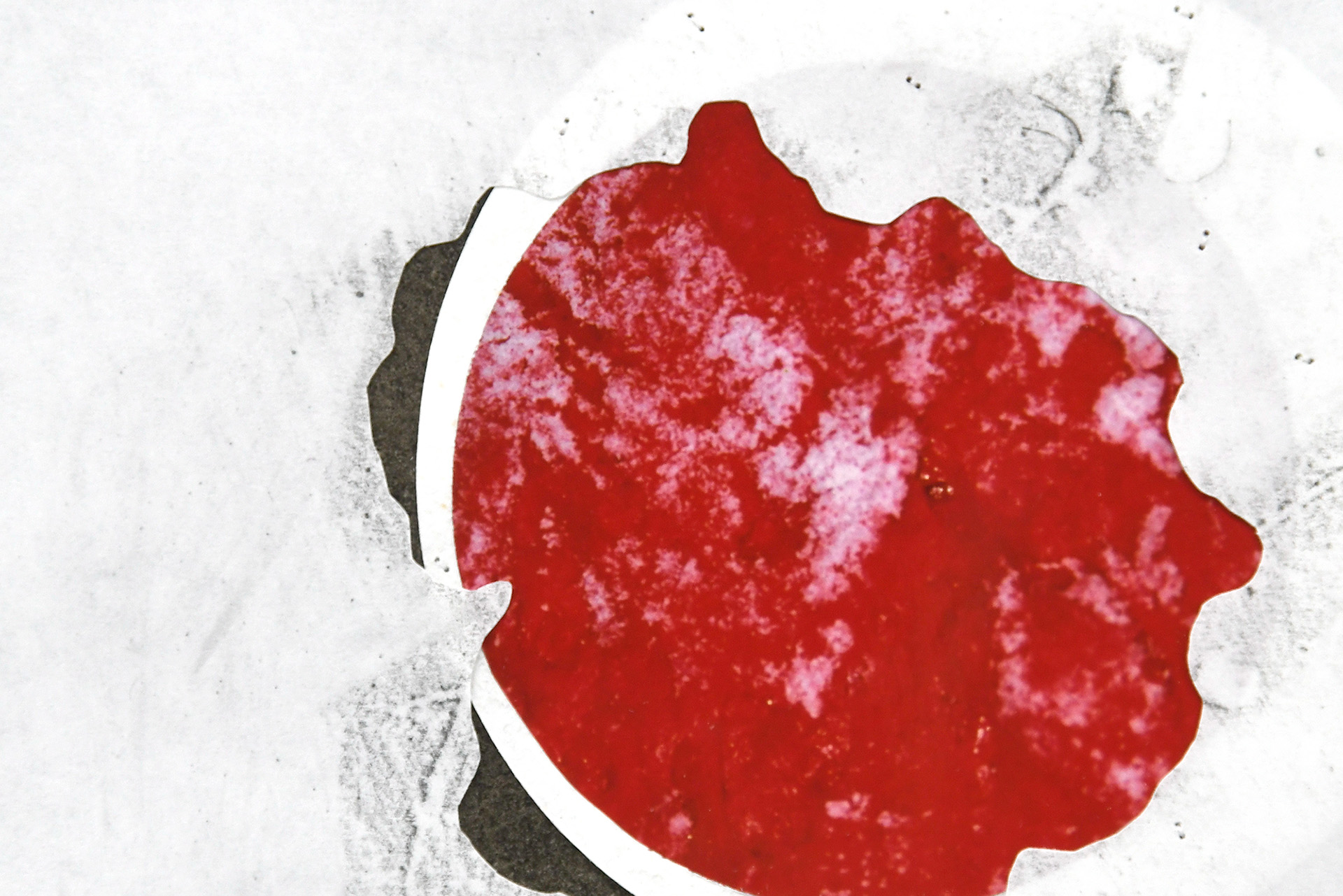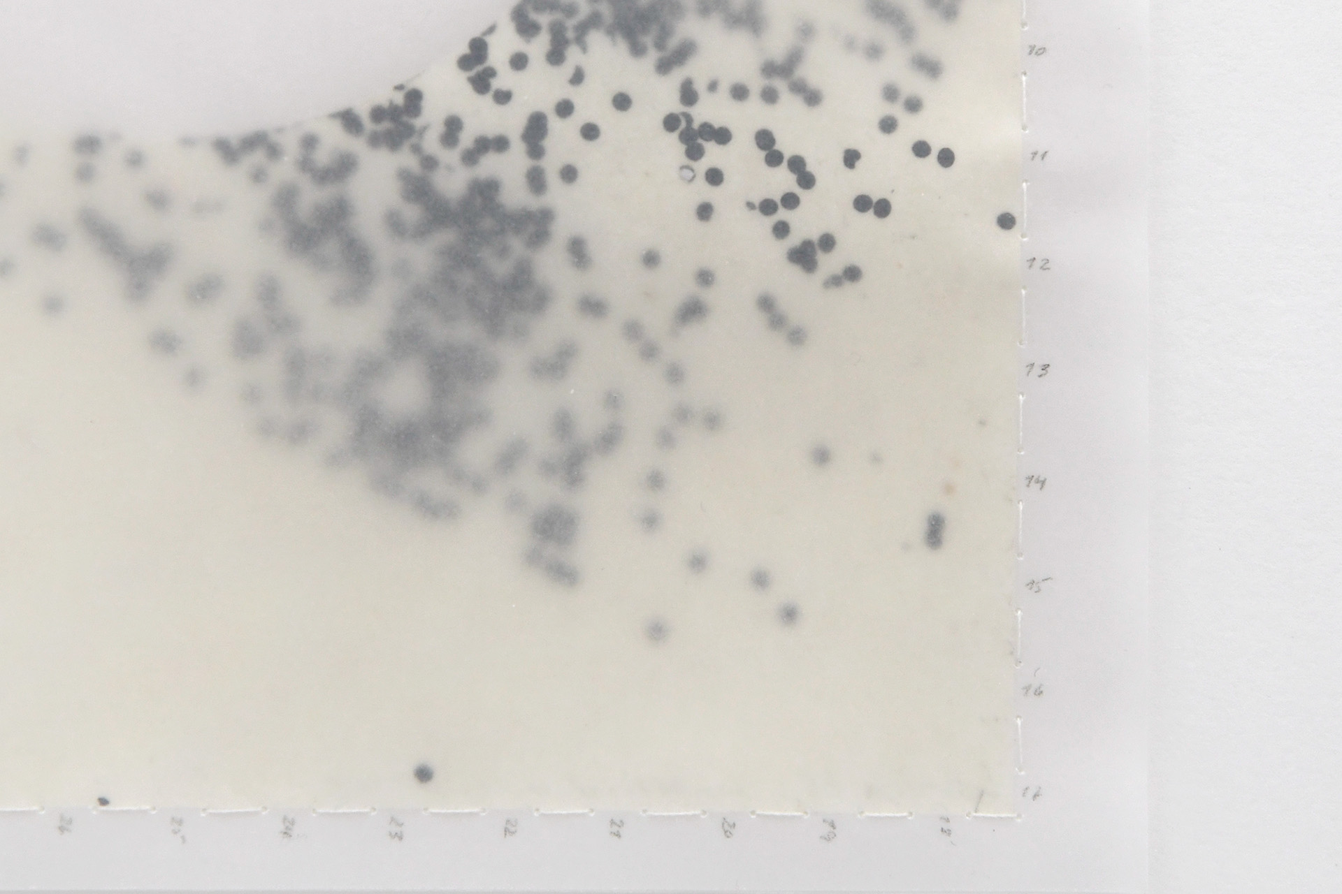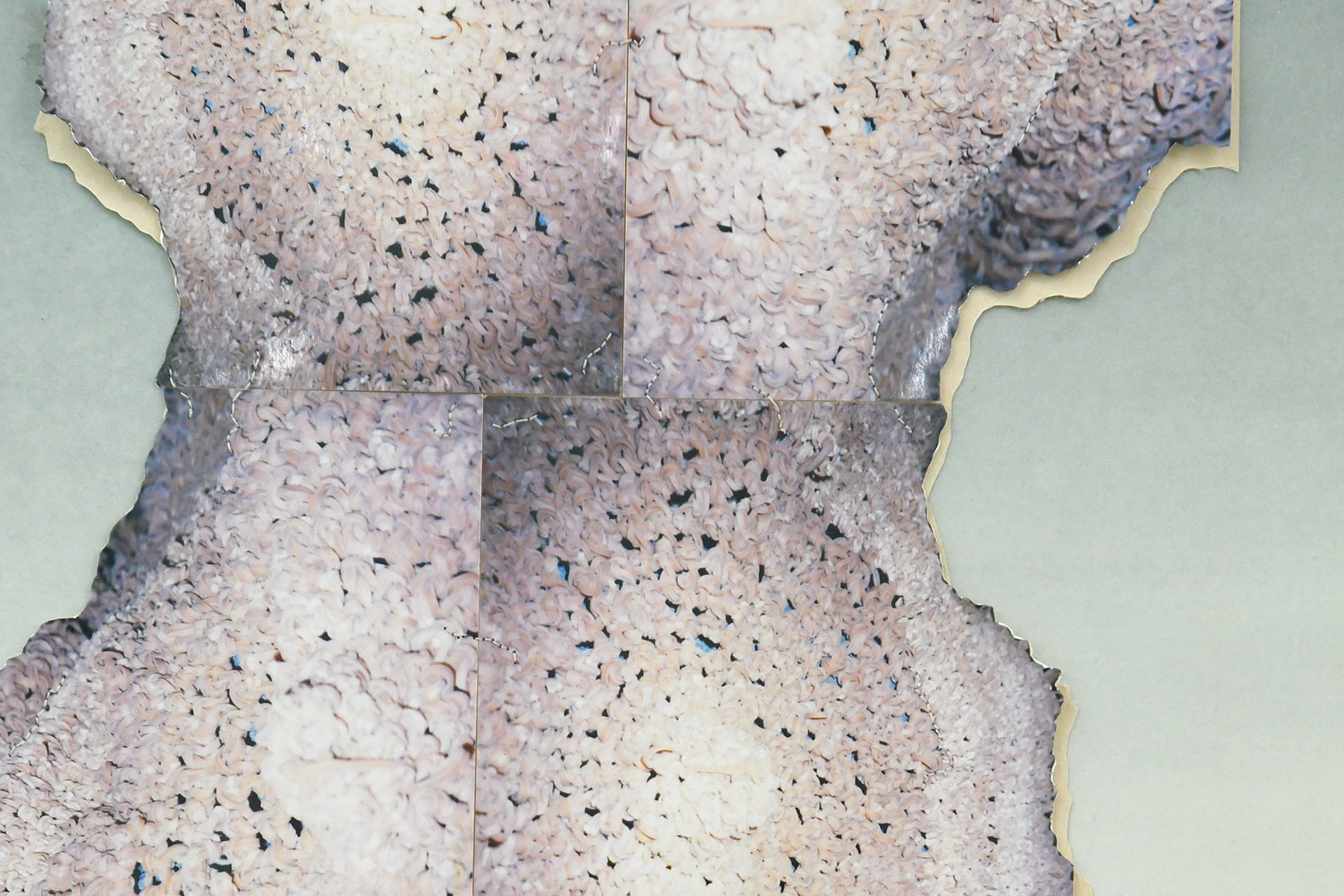Her use of photography started in the 1990s, notably through the recording of various actions carried out by the artist during her postgraduate year at HISK in Ghent. Initially conceived as documentary evidence, several of these images were later incorporated into mural compositions or presented in display cases, generally in the form of fragments manipulated and reworked by the artist in accordance with her unique graphic vocabulary. Guðný Rósa Ingimarsdóttir thus starts with existing photographs— analog prints, subjected to various reprinting operations, taken from her own work documentation or her research on nature and landscape—but the images used only very rarely correspond to the original shot. Cut, partially or completely peeled with a scalpel, turned inside out, stitched or layered, each selected fragment undergoes a series of modifications intended either to reveal possible buried layers or to highlight the beauty of the material by breaking it down to its most fragile state. Like the camera, the scalpel is essential in the artist’s studio. It acts as a drawing tool, producing shapes by subtraction rather than addition. Some of her interventions are almost imperceptible: from a distance, the eye hesitates between photographic image and drawn lines; up close, the (im)precision of the gesture is revealed. Under the artist’s fingers, photography thus becomes a layered material, endowed with an almost sculptural dimension, where the front and back acquire equal value.