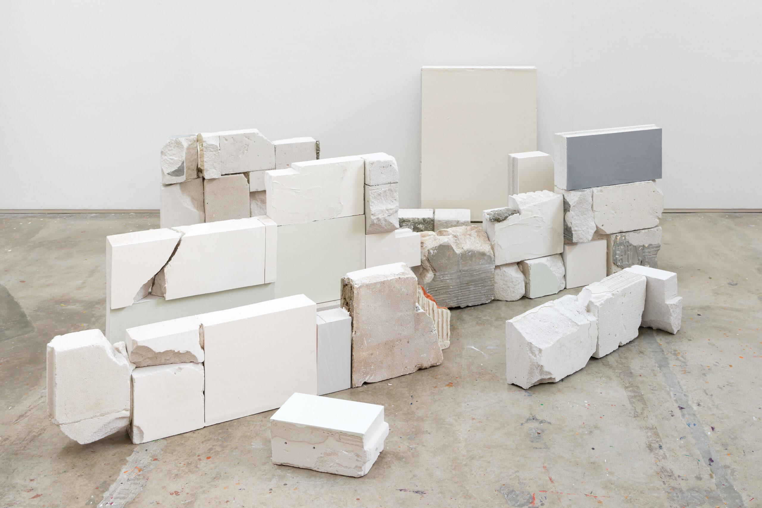 In the long corridor, Opening Windows With Stones stands as an obstacle: a physical barrier that also carries a symbolic meaning. Without any apparent connection between them, the blocks seem about to crumble, but they mutually support one another, leaving cracks through which the light can pass and our eyes can see. When viewed up close, each stone shows signs of its origin – pieces of plaster, cement, mortar, brick, chipped patches – all testifying to the ongoing process of destruction. The artist does not attempt to reconstruct what has been lost; instead, she organises the fragments into a body which preserves the marks of the destruction that has taken place and shows us the contradictions of the present, questioning how the city manages its own memory. The installation thus functions as a form of archaeological criticism, in which our understanding of the precariousness of the whole is not limited to its formal dimension, causing us instead to reflect on everything that is lost with the disappearance of buildings, be they historical or self-built – the material, but also the stories, the collective practices and the ways of life that are erased by contemporary developments, all undertaken in the name of progress.